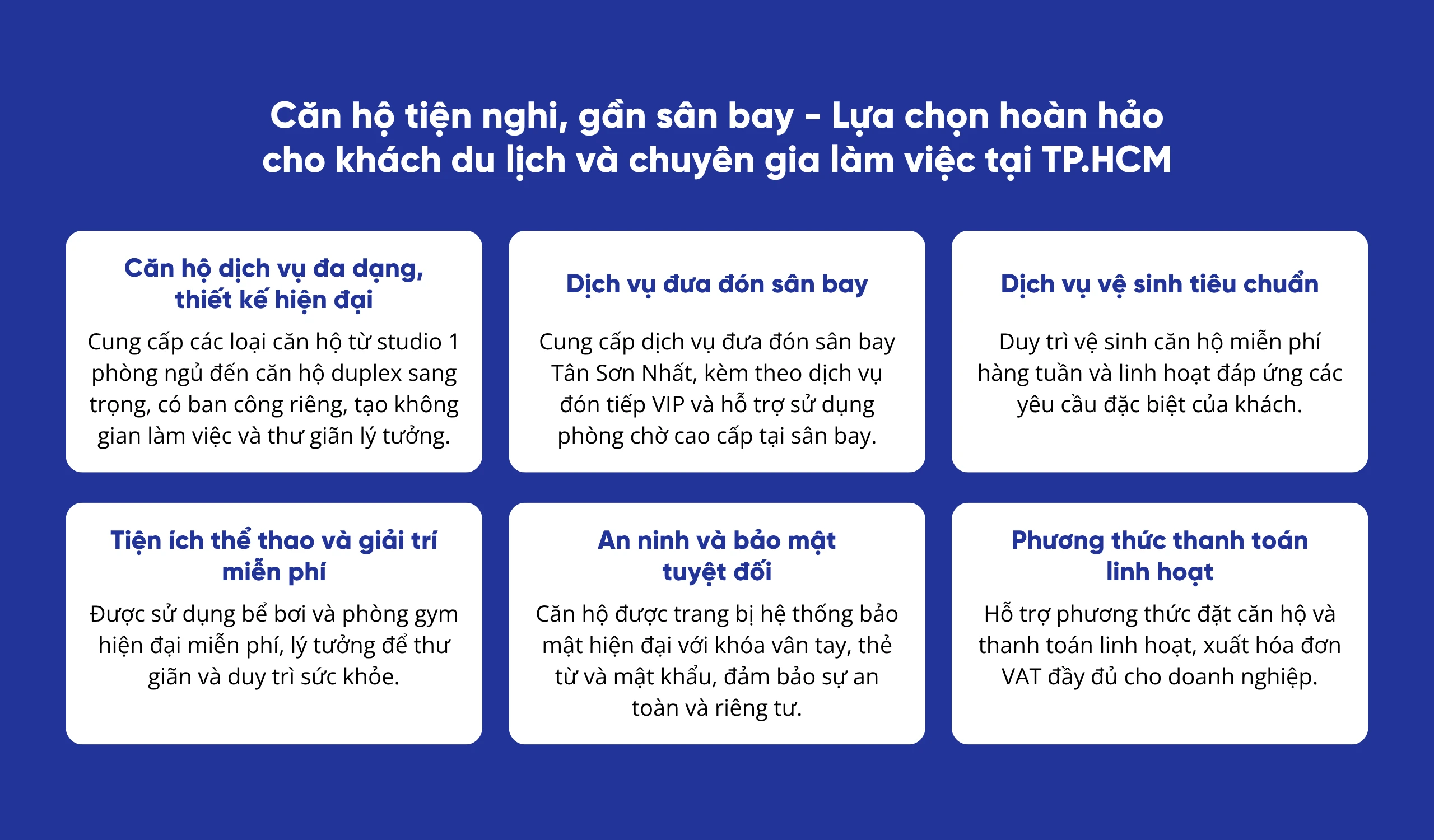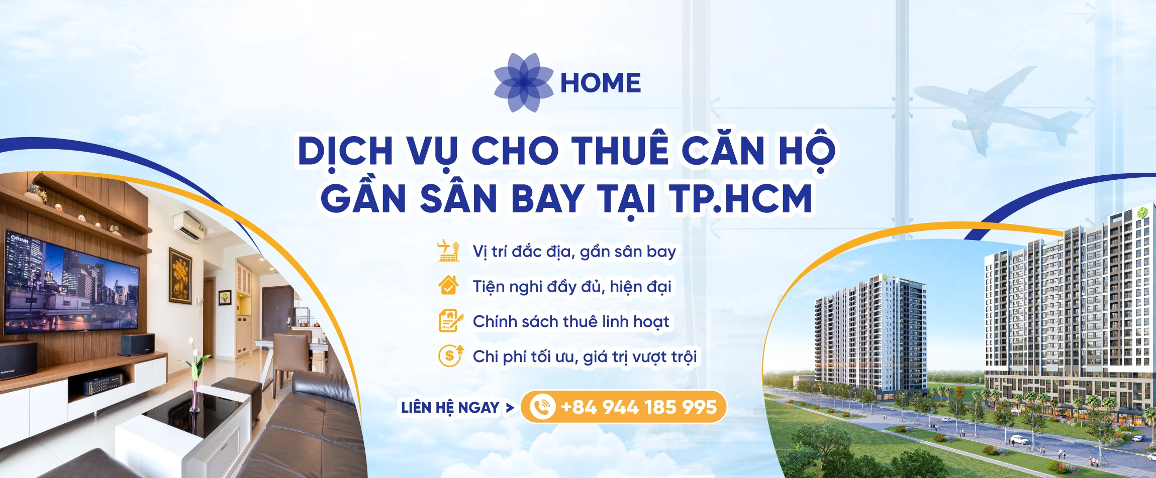 HOME chuyên cung cấp dịch vụ cho thuê căn hộ chất lượng cao tại khu vực gần sân bay Tân Sơn Nhất cho chuyên gia nước ngoài, gia đình, doanh nhân và các cá nhân có nhu cầu lưu trú ngắn hạn hoặc dài hạn. Với đội ngũ tư vấn giàu kinh nghiệm, chúng tôi luôn hỗ trợ kịp thời cho khách hàng.