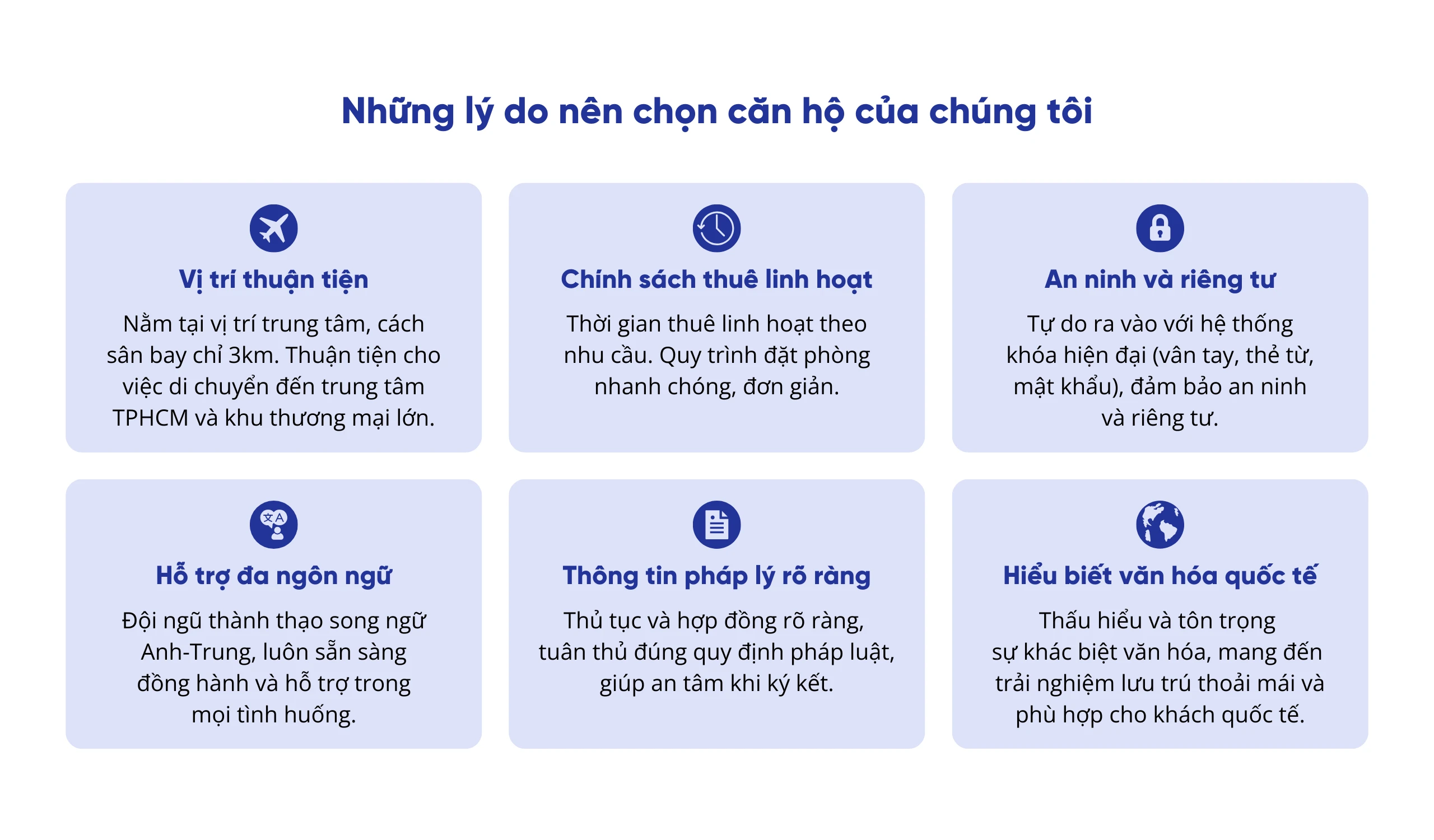 Với hơn 10 năm kinh nghiệm trong lĩnh vực căn hộ dịch vụ, HOME mang đến giải pháp lưu trú hiện đại và chuyên nghiệp cho người nước ngoài. Chúng tôi tự hào là đối tác tin cậy của doanh nghiệp, chuyên gia và gia đình quốc tế đến từ Mỹ, Úc, châu Âu, Anh, Trung Quốc và Hàn Quốc.